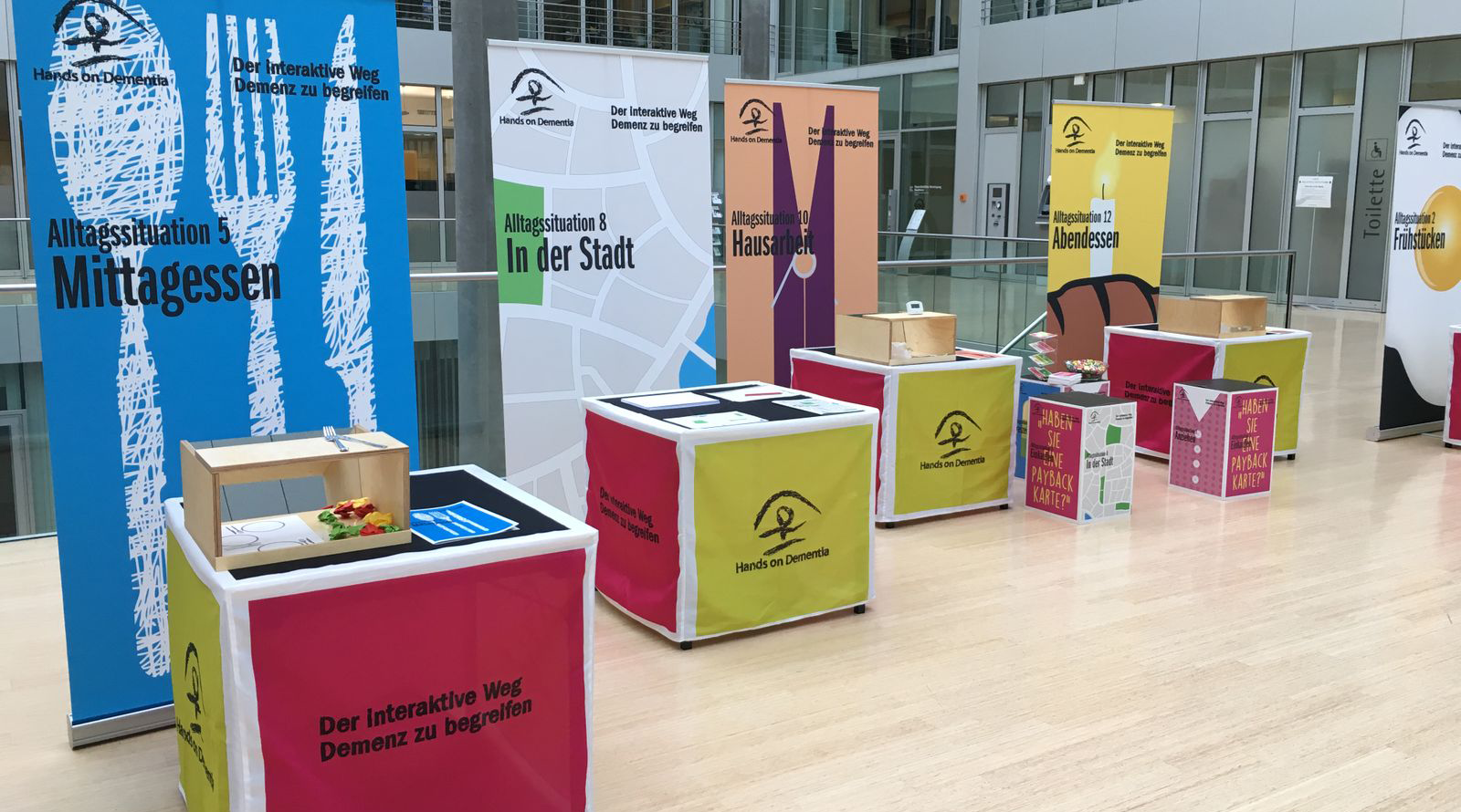 Im Rahmen dieser Kampagne kommt während drei Wochen ein Demenzsimulator zum Einsatz, der Demenz erlebbar macht. Mit verschiedenen, interaktiven Posten werden die Symptome einer Demenz erfahrbar gemacht.
