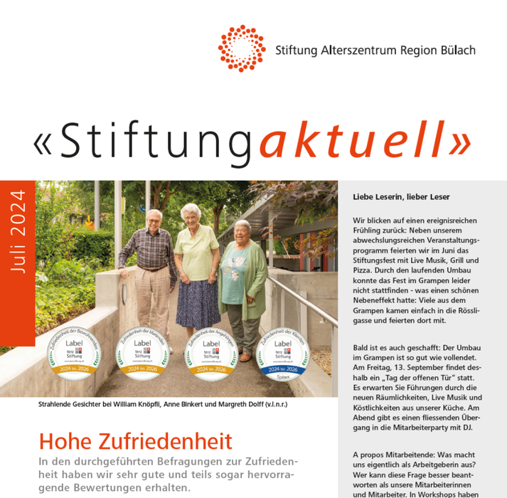Erfahren Sie, welche Themen die Stiftung aktuell bewegen. Es erwarten Sie Einblicke in den Alltag der Stiftung, das tolle Ergebnis und die hohe Zufriedenheit (terzLabel) bei den Befragungen all unserer Anspruchsgruppen, der Abschluss des Umbaus des 20-jährigen Grampen mit vielen Neuerungen und ein Rückblick auf schöne Anlässe in der Stiftung.
