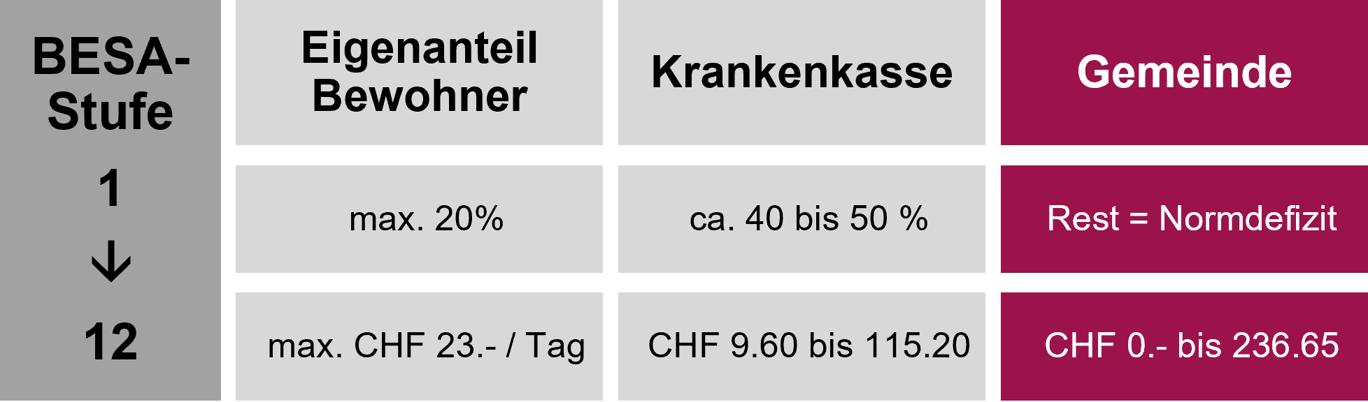 Zu Lasten des Bewohnenden wird gem. Art. 25a KVG ein Eigenanteil Pflegekosten von maximal CHF 23.00 pro Tag erhoben. Die Kostenbeteiligung (Franchise und Selbstbehalt) gegenüber der obligatorischen Krankenpflegeversicherung fällt unabhängig davon an (Art. 64 KVG).